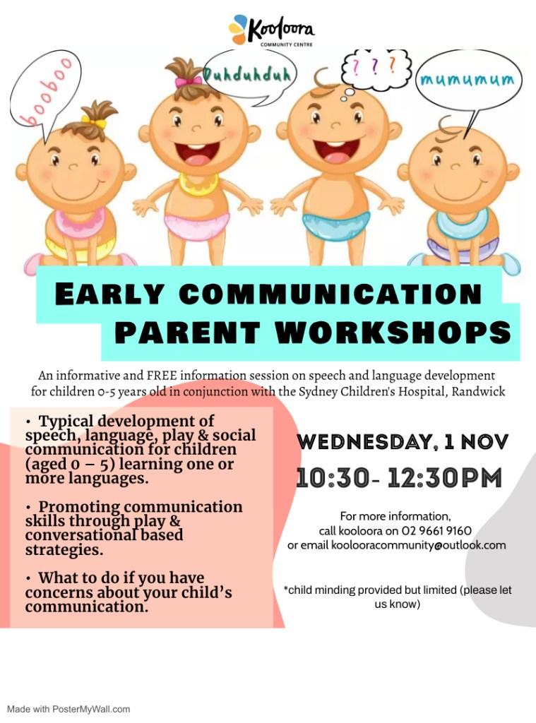 We are hosting a free workshop for families with children aged 0-5 years old focusing on Early Communication in babies and Toddlers. The information session will be delivered by a qualified Speech Pathologists from Sydney’s Children’s Hospital. For inquiries, please call 02 9661 9160 or email koolooracommunity@outlook.com